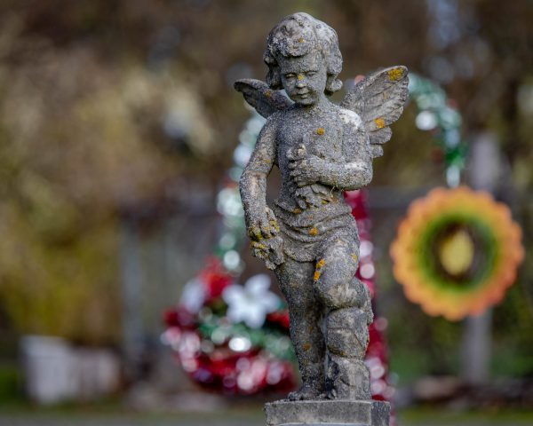 “Oh dear, my little Cherubs”, she chuckled as she bent to pick up one of the gnomes, “you’re not in your place little man, here we go.” She tottered over to the back of the garden, placing all the gnomes back around the pond in their perfect positions, digging them back into the dirt. She rearranged the cherubs around her flowerbeds, complimenting their cherry faces, occasionally tipping dirt over them and muttering to herself about vandals. She steadied the poor deer on her stand and patted her head, hands on her hips, satisfied at her positioning.